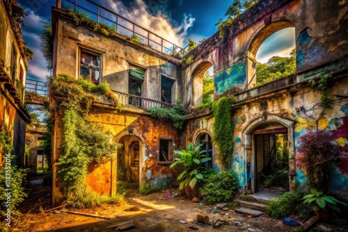 decay, graffiti, industrial, dark, shadowy, urban decay, exploration, photo, derelict, ruin, overgrown, vegetation, peeling paint, texture, gritty, atmospheric, high contrast, mystery, abandonment, forgotten, hidden, secret, wasteland, aged, weathered, old building, city landscape, shadow play, contrast, detail