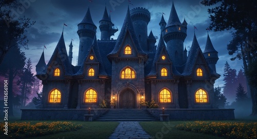 dark enchanted castle with glowing windows cinematic view background
