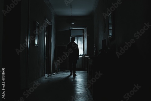 hallway, dark, silhouette, figure, person, standing, light, window, door, corridor, interior, room, gloomy, mysterious, shadow, alone, back, suspense, ominous, eerie, haunted, desolate, forgotten, antique, aged, floor, wall, ceiling, night, building