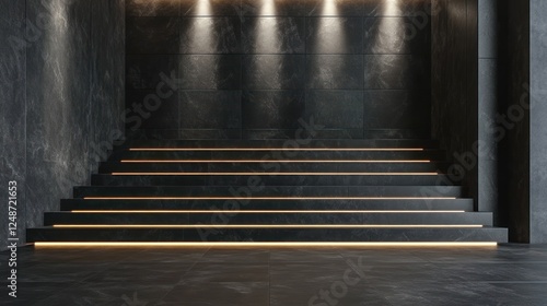 stair, staircase, step, marble, dark, black, stone, interior, design, architecture, modern, luxury, elegant, light, lighting, glow, illumination, warm, gold, shadow, wall, floor, room, space, background, texture, pattern, surface, abstract, minimal, simple, geometric, line, perspective, angle, corner, building, hallway, corridor, entrance, display, product, presentation, empty, blank, scene, render, three-dimensional