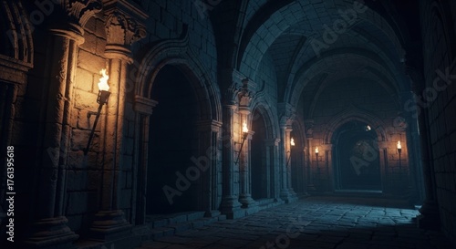Dark Medieval Castle Corridor with Torches Illuminating Stone Arches and Columns