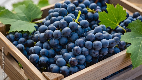 Dark purple grapes with green leaves in rustic wooden crate, golden hour lighting