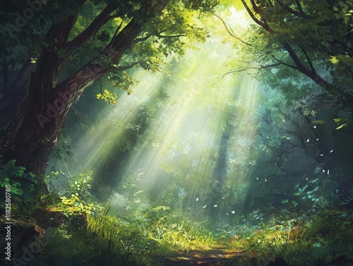 dark rainforest scene where sun rays pierce through dense foliage, illuminating rich greenery and creating an atmospheric, enchanting forest filled with fantasy elements