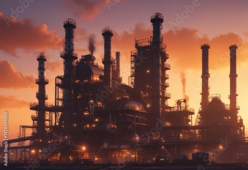 Dark refinery profile against vibrant sunrise , pipes, colorful, power
