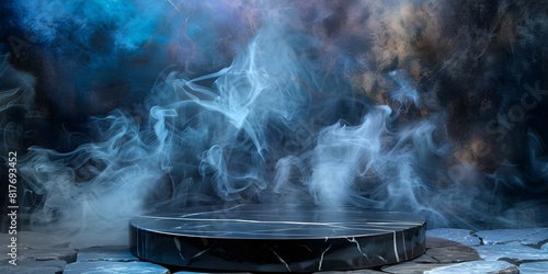 Dark room with a black marble podium and smoke on stone floor. Concept Dark Room, Black Marble Podium, Smoke, Stone Floor