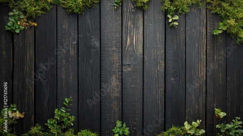 Dark wooden planks with green moss and small plants around the edges providing natural texture and copy space for design elements.