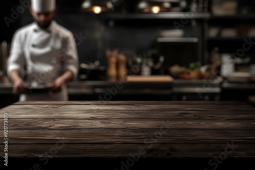 Dark wooden table in front of a blurred kitchen background with a chef in the background.