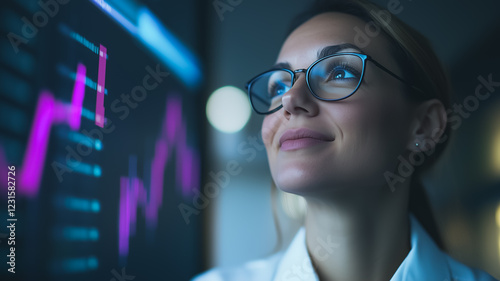 finance, graph, chart, screen, technology, woman, female, confident, thoughtful, strategic, planning, business, professional, career, success, future, progress, growth, innovation, digital, modern, information, research, statistic, workplace, office, corporate, entrepreneur, leadership, vision