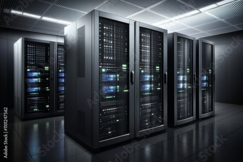 computing, database, datacenter, information technology, metaphor, networking, render, server, solution, support, datum, center, network, equipment, room, organised, order, row, neat, arrangement, neatness, orderly, dim, lighting, row, side, floor, black, tile, wall, paint, colours, grey, dark, facility