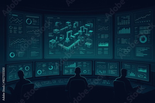 Data visualization in a futuristic control room showcasing advanced analytics, operational efficiency, and interconnected systems with emphasis on technology and decision making
