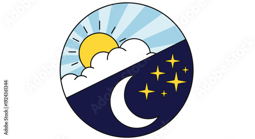 day, night, sun, moon, star, cloud, cycle, time, earth, transition, changing, graphic, icon, emblem, logotype, flat, design, weather, nature, ecology, environment, meteorology, astronomy, balance, duality, cleaving, circle, diagonal, ray, crescent, bright, dark, sky, atmosphere, passing, clean, outline, harmony, contrast, schedule, calendar, forecast, education, planning, global, opposition, progress, round, half
