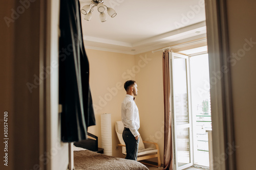 Daylight illuminates handsome groom while he stands before a window