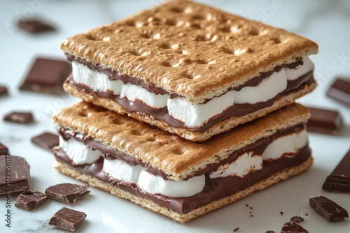 decadent s'mores stacked neatly on a pristine white surface, highlighting the gooey marshmallow, rich chocolate, and crisp graham crackers, ready for enjoyment
