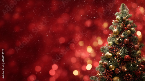 Decorated christmas tree against a red bokeh background with falling snow effects