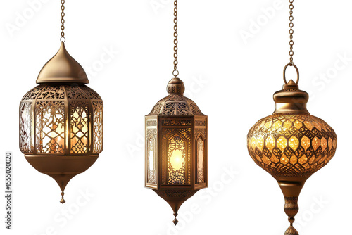 Decorative gold lanterns symbolizing Ramadan Mubarak hanging elegantly for festive celebration during the holy month of Ramadan in a warm, inviting atmosphere