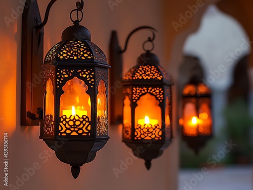 Decorative illuminated lanterns hanging on a warm toned exterior wall