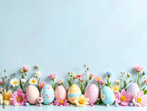 Decorative Pastel Easter Eggs and Colorful Spring Flowers Background with Large Copy Space