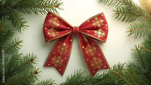 Decorative Red Bow with Snowflakes Surrounded by Fresh Evergreen Pine Branches for Holidays