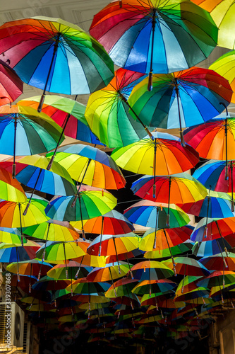 Decorative umbrellas in the streets of Bucharest, Romania
