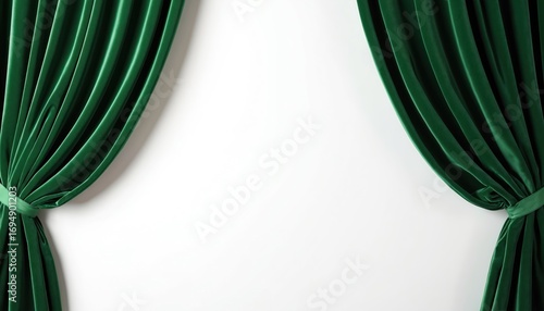 Deep green velvet curtains frame clean white background, creating rich texture, elegant lines. Soft fabric drapes beautifully, held by matching ties, suggesting luxury, sophistication for home decor