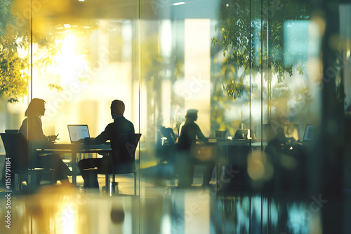 Defocused abstract background featuring a modern meeting room with natural light and a professional team collaborating. Ideal for business and corporate visuals.