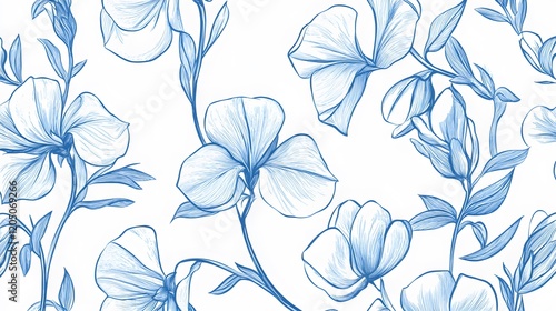 blue, floral, pattern, design, botanical, flower, leaf, flower petals, stem, line, art, illustration, delicate, elegant, white, background, texture, seamless, repeat, style, nature, spring, summer, blossom, bloom, plant, vignetting, drawing, graphic, pretty, aesthetic, beauty, detailed, intricate, whimsical, serene, calm, calmness, vibrant, pastel, monochrome