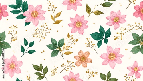 floral, pattern, pink, peach, gold, leaf, green, white, design, delicate, elegant, soft, botanical, flower, seamless, texture, background, illustration, wallpaper, spring, summer, romantic, pastel, nature, decorative, beautiful, colourful, bright, creative, modern, stylish, professional, vibrant, stunning, amazing, marvellously, fantastic, gorgeous, lovely, charming, attractive, impressive, spectacular, magnificent, excellent, honed