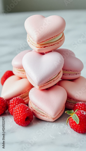 Delicate pink heart-shaped macarons stacked with fresh strawberries and raspberries on a marble surface