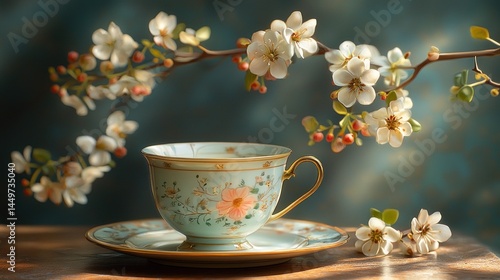 Delicate teacup and saucer adorned with spring blossoms. Soft lighting, muted colors, and a serene atmosphere