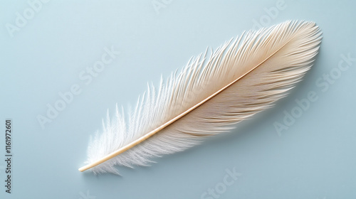 Delicate white feather on soft blue background, showcasing natural beauty