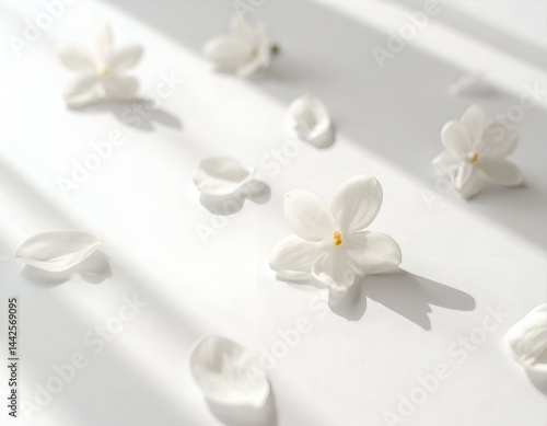 Delicate white flowers and petals scattered on a bright white background, illuminated by sunlight creating soft shadows. Perfect for beauty, spa, or wellness themes.
