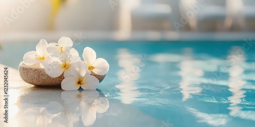 Delicate white flowers resting on a smooth stone beside a serene blue pool.