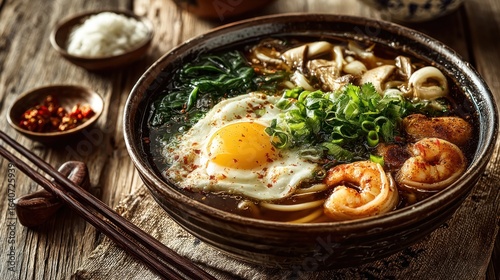 ramen, noodle, egg, fried, shrimp, spinach, mushroom, broth, japanese, cookery, bowl, dish, food, gastronomy, culinary, meal, delicious, epicure, healthy, nourishment, eatery, lunch, dinner, oriental, wooden, table, rustic, delicacy, favor, spice, greener, garnish, herb, traditional, fresh, tasty, plate, chili, chopstick, background, still, life
