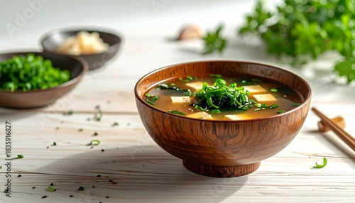 Delicious and healthy Japanese miso soup in a wooden bowl, garnished with fresh tofu, wakame seaweed, and scallions