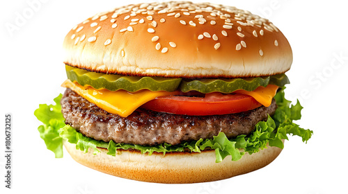Delicious and juicy hamburger with cheese, tomato, lettuce and pickles isolated on transparent background