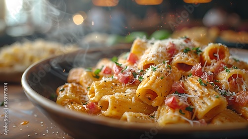 Delicious appetizing classic pasta with tomato sauce, parmesan