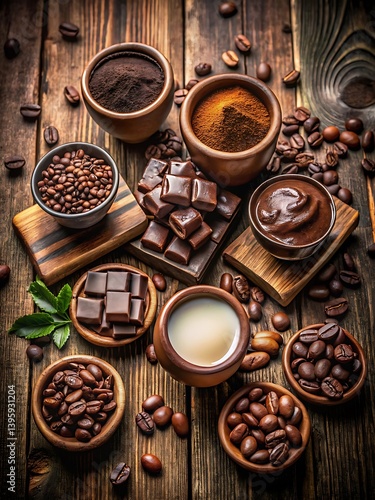 Delicious assortment of coffee, cocoa powder, milk, chocolate pieces in small rustic wooden bowls.