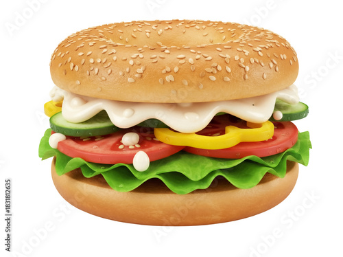 bagel, sandwich, food, isolated, breakfast, lunch, snack, vegetable, sauce, tomatoes, cucumber, lettuce, pepper, sesame, bun, bread, fresh, healthy, tasty, delicious, appetising, meal, fast food, vegetarian, vegan, diet, nourishment, epicure, cookery, eatery, cafes, bakery, ingredient, clip art, design element, transparent