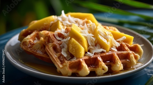 Delicious belgian waffles topped with mango slices and shredded coconut for a tropical breakfast