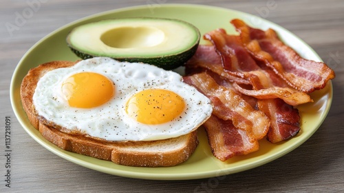 breakfast, egg, bacon, avocado, toast, food, meal, snack, cookery, nourishment, protein, morning, healthy, organic, diet, epicure, brunch, fried, yellow, yolk, side dish, plate, savoury, fresh, cooked, ingredient, culinary, tasty, farmer, homemade, vibrant, colourful, appetising, natural, delicious, crispy, lifestyle, table, rustic, feast, family, energy, eatery, comfort food, simple