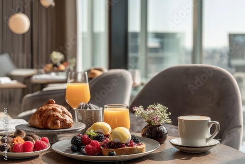 breakfast, food, morning, meal, healthy, delicious, egg, poached, croissant, pastry, cappuccino, hot drink, drink, beverage, fruit, berry, raspberry, blackberry, blueberry, table, eatery, cafes, dining, epicure, luxury, lifestyle, brunch, hotel, indoor, window, light, sunny, fresh, vibrant, colourful, tasty, nourishment, hospitality, catering