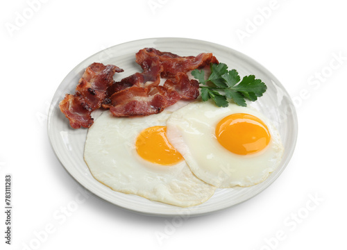 Delicious breakfast with sunny side up eggs isolated on white