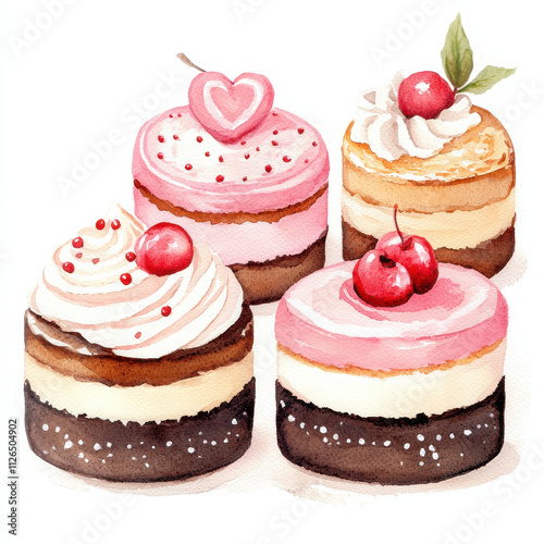 watercolor, isolated, white, background, cake, dessert, sweet, colourful, cherry, cream, frosting, pastry, celebration, food, illustration, festive, treat, epicure, bakery, confection, layer, pink, brown, round, decoration, holiday, party, indulgent, delicious, hand-made, art, design, festive season, joyful, whipped cream, sugar, artistic, vibrant, chinese new year