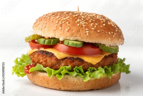 Delicious Cheeseburger with Fresh Ingredients, A mouthwatering cheeseburger with a crispy patty, melted cheese, lettuce, tomato, pickles, and a sesame seed bun on a white background.