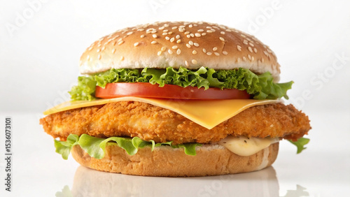 chicken, sandwich, burger, fast food, meal, snack, food, tasty, delicious, unhealthy, calorie, bread, sesame seeds, bun, lettuce, tomatoes, cheese, cheddar, slice, crisp, fried, gold, mayo, sauce, ingredient, epicure, eatery, closeup, studio shot, isolated, white background, culinary, cookery, nourishment, diet, appetence, hunger, eating, food photography, vertical, fresh, appetising, junk food, isolated on white, cooked, half face, macro, closeup