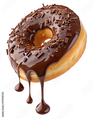 Delicious chocolate frosted donut with dripping icing and sprinkles close-up