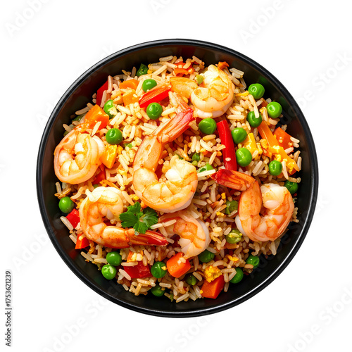 shrimp, rice, fried, bowl, black, food, meal, cookery, asian, dinner, lunch, cooked, garnished, fresh, tasty, healthy, diet, nourishment, protein, vegetable, pea, carrot, red, green, colours, texture, macro, overhead, isolated, studio, close, up, plate, epicure, delicious, flavorful, spicey, egg, aroma, served, dish, seafood, presentation, detail, bright, appetising, edible