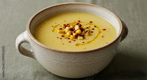 Delicious Corn Soup in Bowl with Toasted Corn and Chili Flakes