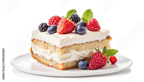 cake, berry, raspberry, blueberry, blackberry, dessert, sweet, delicious, food, pastry, bakery, fresh, tasty, deliciously, whipped cream, sponge cake, fruit, plate, white plate, isolated, closeup, food photography, confectionery