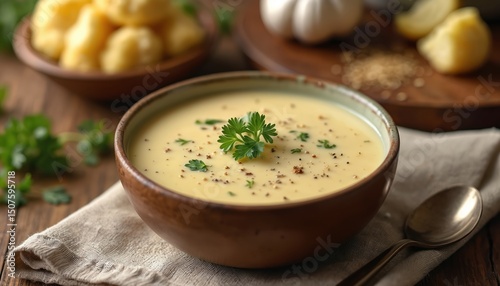 Delicious creamy cauliflower soup garnished with fresh parsley. Homemade meal bowl on wooden table with spoon. Healthy food, vegetarian dish for lunch dinner.